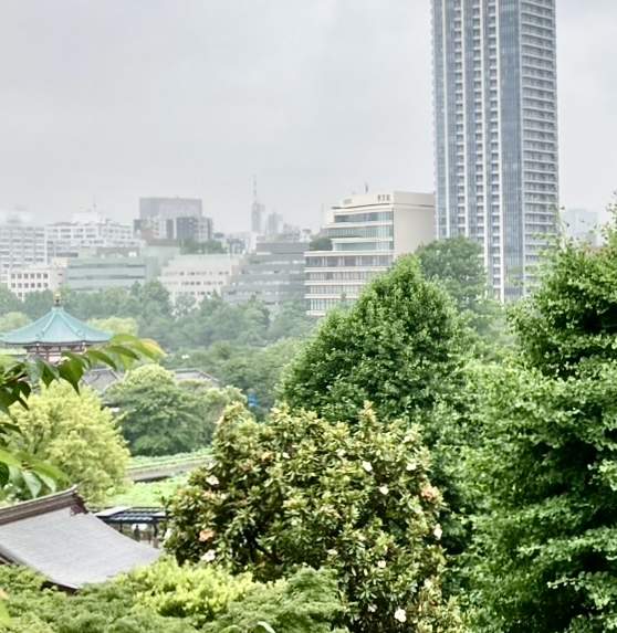 食事は青々とした梅の木の茂るお庭に面して大きなガラス窓のある2階のお部屋。窓越しに不忍池弁天堂も眺めることができます。