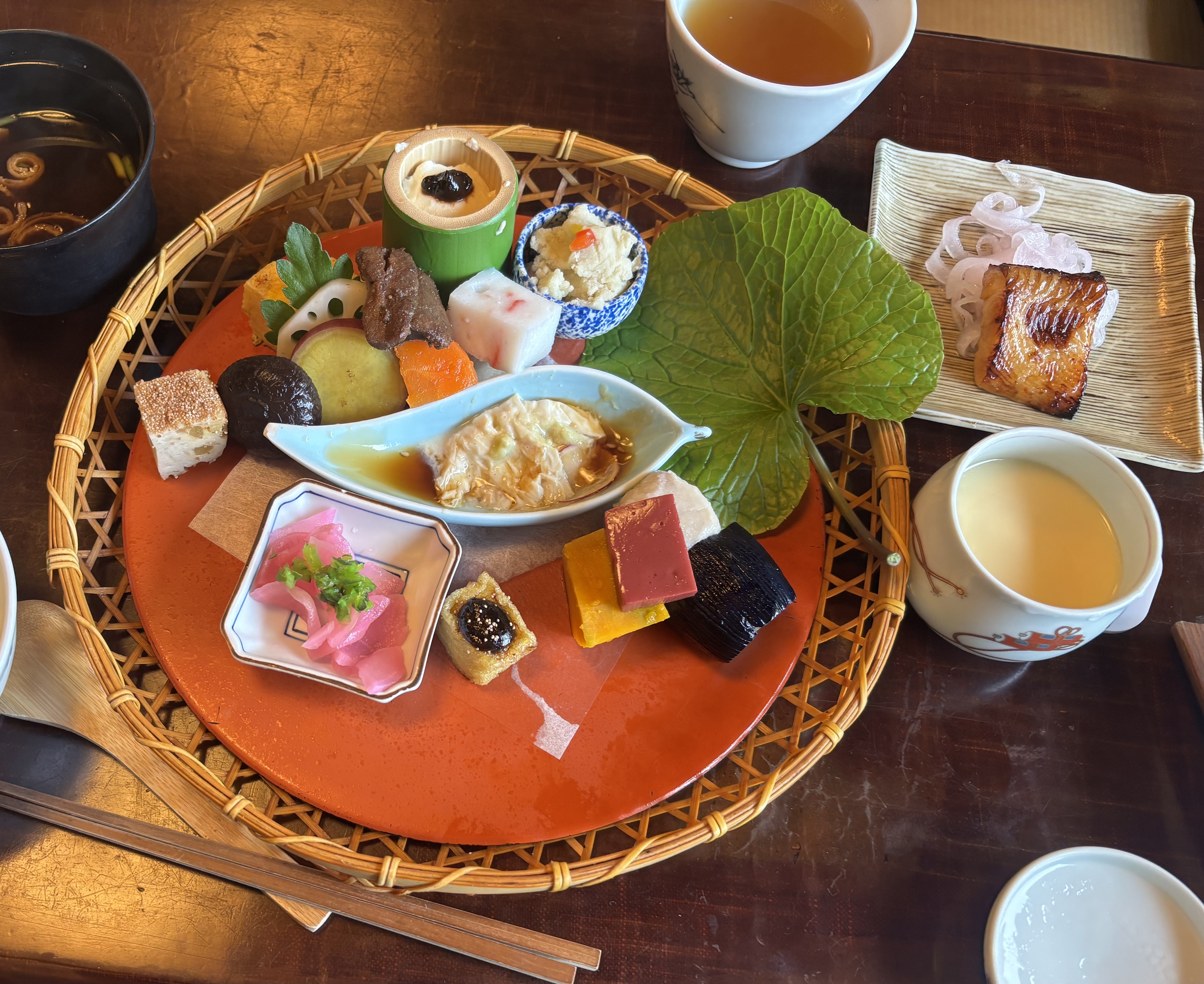 なかなか予約も取れない韻松亭は明治8年創業で趣の有る建物と、大豆などの自然食品を生かした繊細なお料理でよく知られています。皆様(花籠膳 月)を頂きました。季節のお野菜が様々に工夫されたお食事を堪能いたしました。